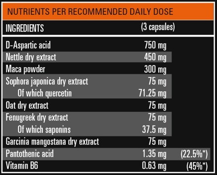 Este produto foi formulado para apoiar e melhorar o sistema hormonal naturalmente, com foco no aumento dos níveis de testosterona. Cada dose de 3 cápsulas contém uma combinação de ingredientes naturais cuidadosamente selecionados por seus benefícios hormonais e energéticos: 1. Ácido Aspártico (750 mg): 6. Estimula a produção de testosterona atuando na glândula pituitária, aumentando a liberação de hormônios-chave que regulam a produção de testosterona nos testículos. 7. Extrato de Urtiga (450 mg): 12. Ajuda a aumentar os níveis de testosterona livre bloqueando a ligação da globulina de ligação aos hormônios sexuais (SHBG), permitindo que mais testosterona esteja disponível para o corpo.