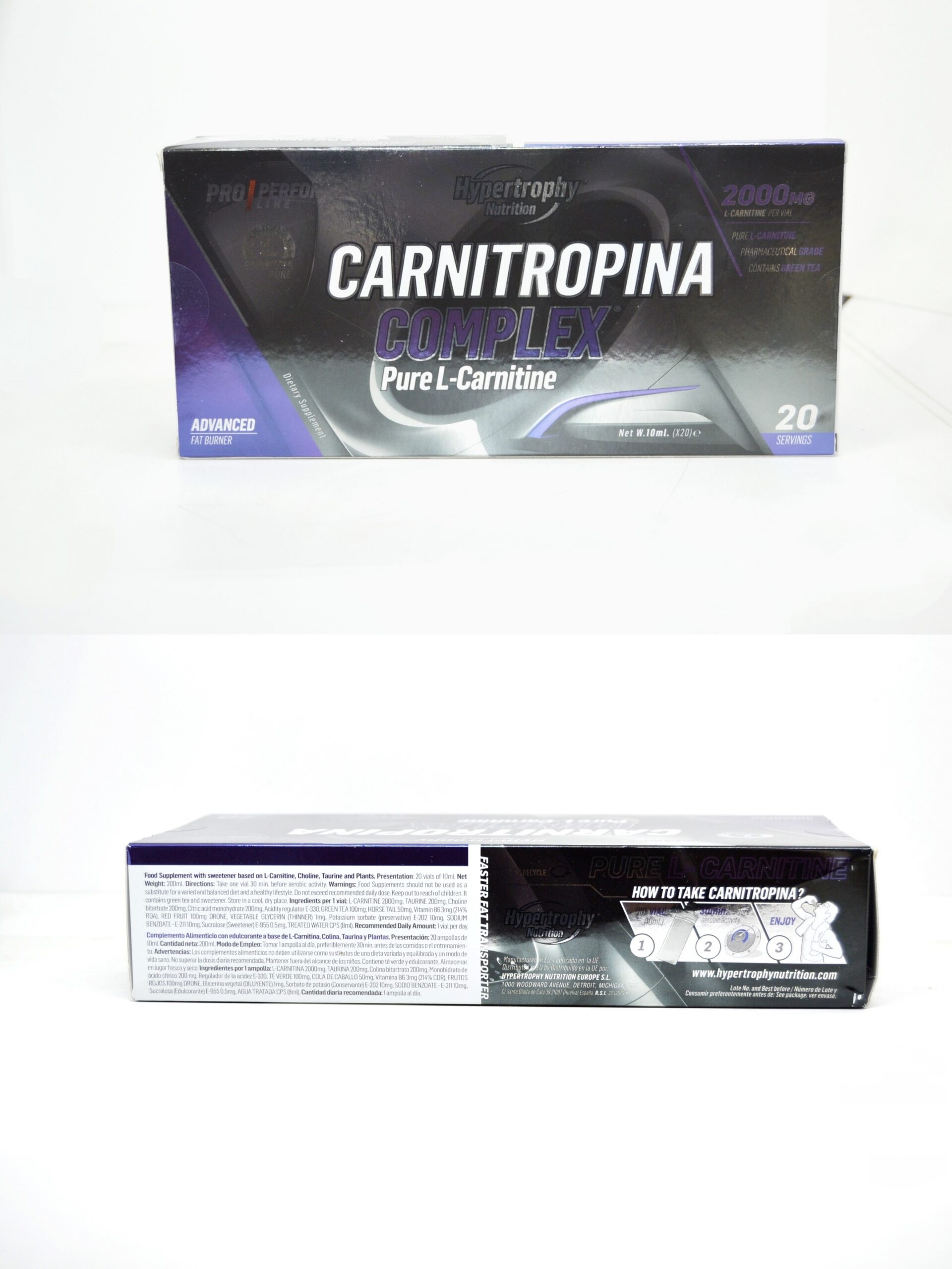 Agente de volume (água), L-Carnitina 2000 mg, L-Taurina 200 mg, Bitartarato de Colina 200 mg, Extrato de chá ( Camellia sinensis (L.) Kuntze, folha ) 100 mg, Extrato de cavalinha ( Equisetum arvense L., partes aéreas ) 50 mg, cloridrato de piridoxina (vitamina B6) 3 mg, Aroma