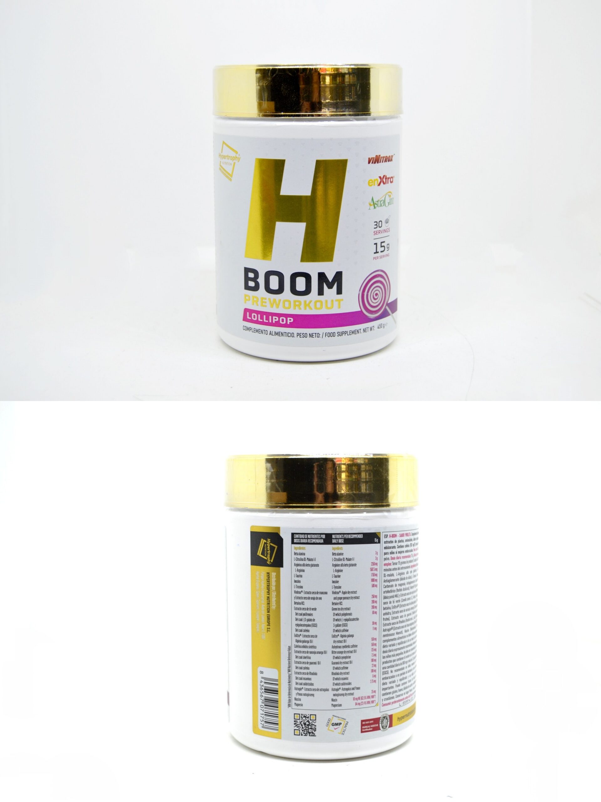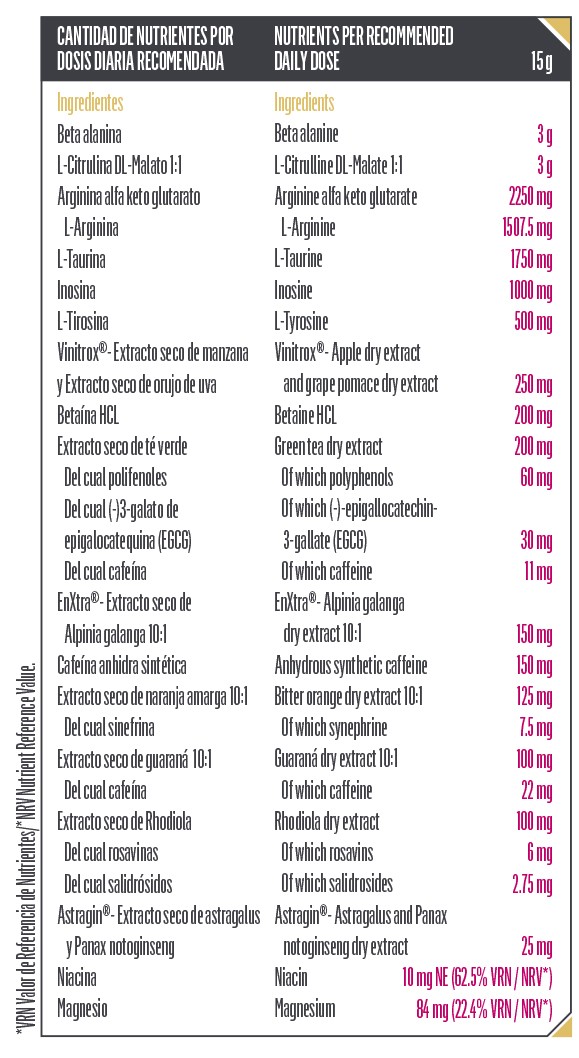 Beta-alanina, L-citrulina DL-malato, L-arginina alfa-cetoglutarato, L-taurina, inosina, antiaglomerante (dióxido de silício), L-tirosina, maltodextrina, aromatizantes, carbonato de magnésio, Agente antiaglomerante (fosfato dicálcico), Vinitrox® (extrato seco de maçã (Malus pumila) e extrato seco de bagaço de uva (Vitis vinifera)), cloridrato de betaína, extrato seco de chá verde (Camellia sinensis, folhas), EnXtra® (Alpinia galangal, raiz), cafeína anidra, extrato seco de laranja amarga (Citrus aurantium, fruto), acidulante (ácido cítrico), extrato seco de guaraná (Paullina cupana, sementes), extrato seco de rhodiola (Rhodiola rosea, raiz), adoçante (sucralose), Astragin® (extrato seco de Astragalus membranaceus e Panax notoginseng) e niacina (nicotinamida).
