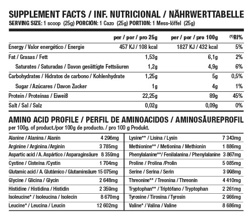 Mistura de Proteínas (Proteína Isolada do Soro do Leite, Proteína Isolada do Soro do Leite Hidrolisada, Proteína Concentrada do Soro do Leite Ultrafiltrada e de Fluxo Cruzado), Óleo Vegetal (Triglicerídeos de Cadeia Média do Óleo de Coco), Aromatizantes