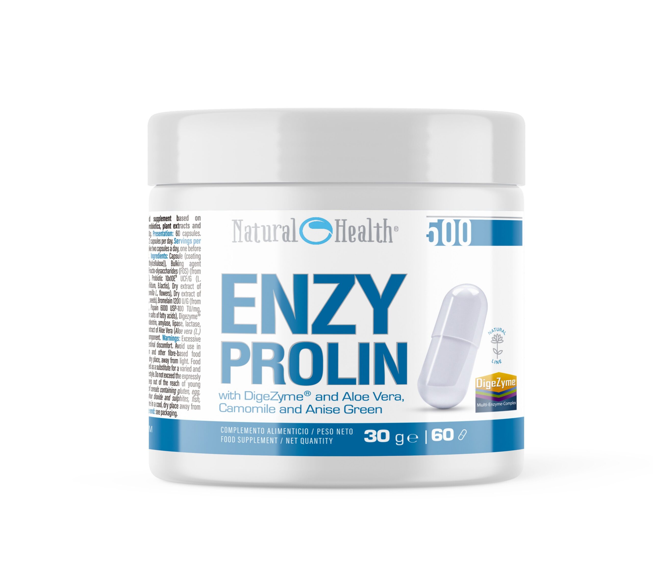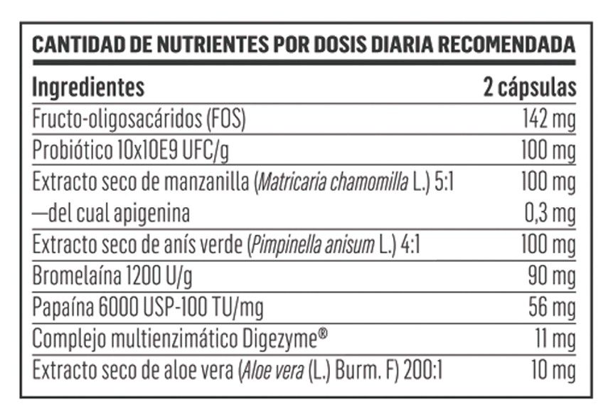 Frutooligossacarídeos (FOS), Probiótico 10×10 E9 UFC/G ( L. acidophilus, B. longum, B. bifidum, B. lactis), Extrato seco de camomila ( Matricaria chamomilla L .flores)), extrato seco de anis verde ( Pimpinella anisum L ., sementes), Bromelaína 1200 U/G, Papaína 6000 USP, complexo multienzimático Digezime® (maltodextrina, amilase, lipase, lactase, celulase e protease) e extrato seco de Aloe Vera ( Aloe vera (L.) Burm. f ., folha).